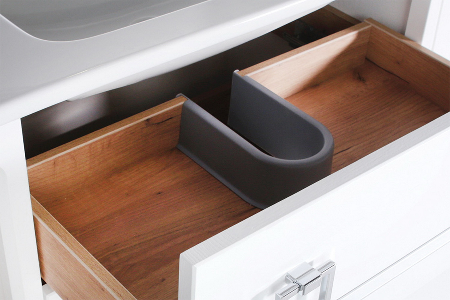 В мебели используется фурнитура ведущих европейских производителей, что гарантирует долгий срок службы и удобство использования. Выдвижные ящики полного выдвижения с доводчиками обеспечивают плавное и бесшумное открывание и закрывание. Это особенно важно в условиях ограниченного пространства ванной комнаты.